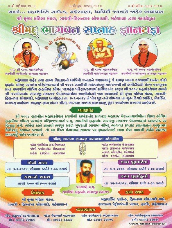 We are glade to invite for Shreemad Bhagwat Saptah Gyanyagn at Mehsana-2 (Gujarat, India) from 6-Jan-2014 (Monday) to 12-Jan-2014 (Sunday). We are kindly request to attend with your family.