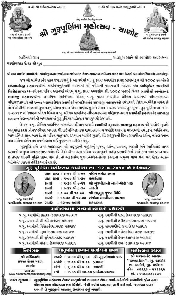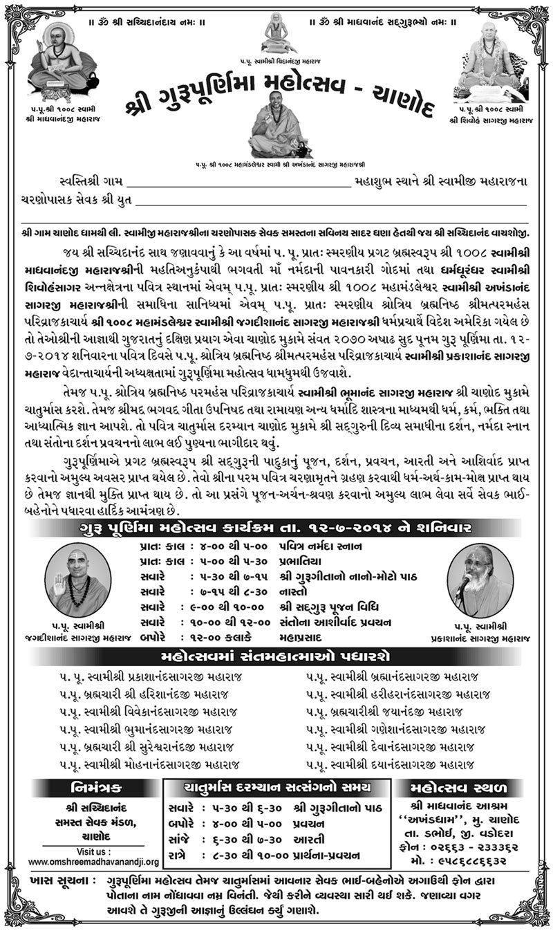 We are glade to invite for Guru Purnima Mahotsav & Chaturmas at Chanod from 12-Jul-2014 (Saturday)